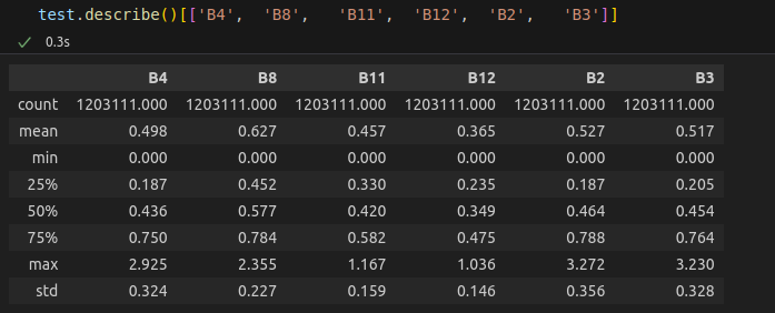A quick summary shows that band values range from 0 up to about 3.2. That range is well below the raw 0 – 10 000 DN scale, yet above the usual 0 – 1 surface-reflectance range, so we’re unsure whether these numbers are:
