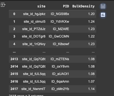 Clearly, the PID is completely different between the two. The PIDs used in the starter notebook do not even appear anywhere in the test set we were given. Not only that, but the BulkDensity values are entirely different (so it's not just the case that there are different PID labels, the two sets are legitimately different):