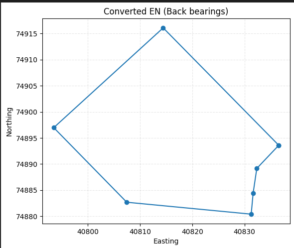 raise ValueError("Empty coords.")ax.set_aspect("equal", adjustable="box")ax.set_xlabel("Easting")ax.set_ylabel("Northing")coords_en, title=f"Converted EN ({'Back' if USE_BACK else 'Forward'} bearings)"@Brainiac Thank you Big man🙇