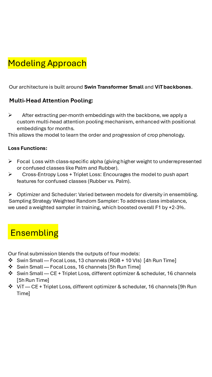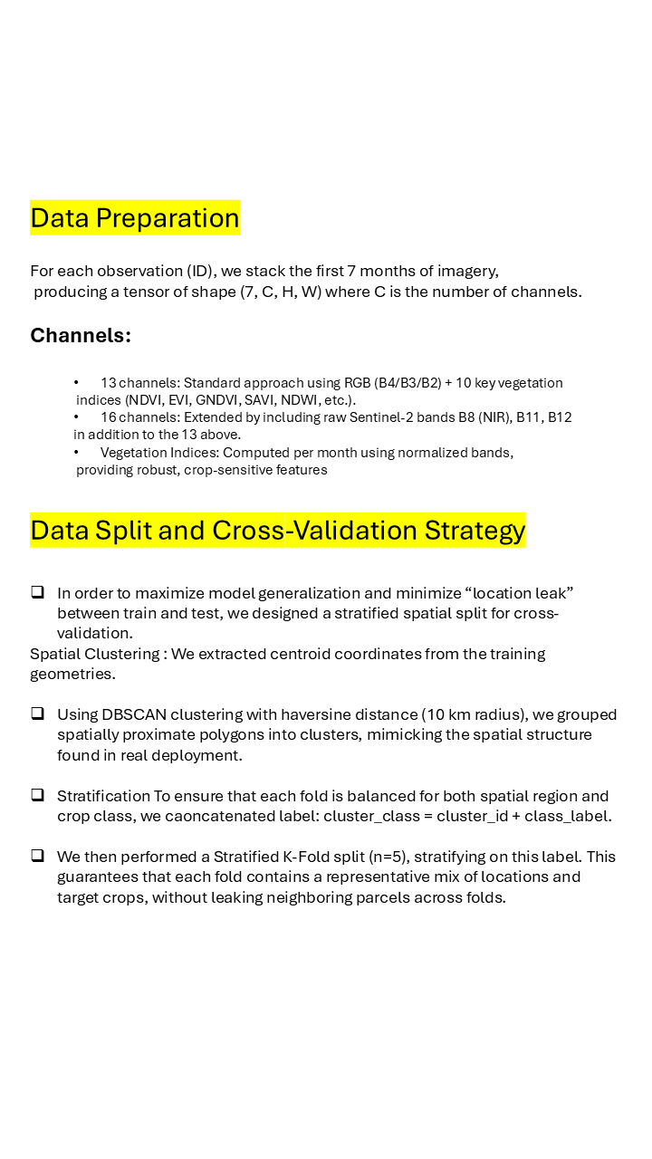 def __getitem__(self, idx): group = self.id_groups.iloc[idx] tif_paths = group['tifPath'] # List of tif paths for this ID target = group['Target'] images = [] for tif_path in tif_paths: image = process_window(tif_path) # Out : (12, H, W) # Normalized RGB rgb_indices = [3, 2, 1, 8, 10, 11] bands = [] for i, idx_band in enumerate(rgb_indices): band = image[idx_band] bands.append( normalize_band( band, method=self.normalization_method, band_index=idx_band+1, sentinel2_stats=self.sentinel2_stats, scale_max=self.scale_max, ) ) img = np.stack(bands, axis=0) # (6, H, W) # Compute and concatenate vegetation indices indices = compute_indices(image) # (10, H, W) img = np.concatenate([img, indices], axis=0) # (16, H, W) if isinstance(img, np.ma.MaskedArray): img = img.filled(0) img = np.moveaxis(img, 0, -1) # (H, W, 16) # keep for albumentations img = img.astype(np.float32) if self.transform: img = self.transform(image=img)["image"] img = torch.tensor(img, dtype=torch.float32) images.append(img) # keep only the first 7 months images = images[:7] images = torch.stack(images, dim=0) # (N_imgs, C, H, W) if self.to_train: target = rev_mapper[target] return images, target else: return imagesWe even implemented an improved version where we took all 12 months in the correct order. Missing months were created as empty arrays with the shape (H, W) of the current observations (the January month is always present).