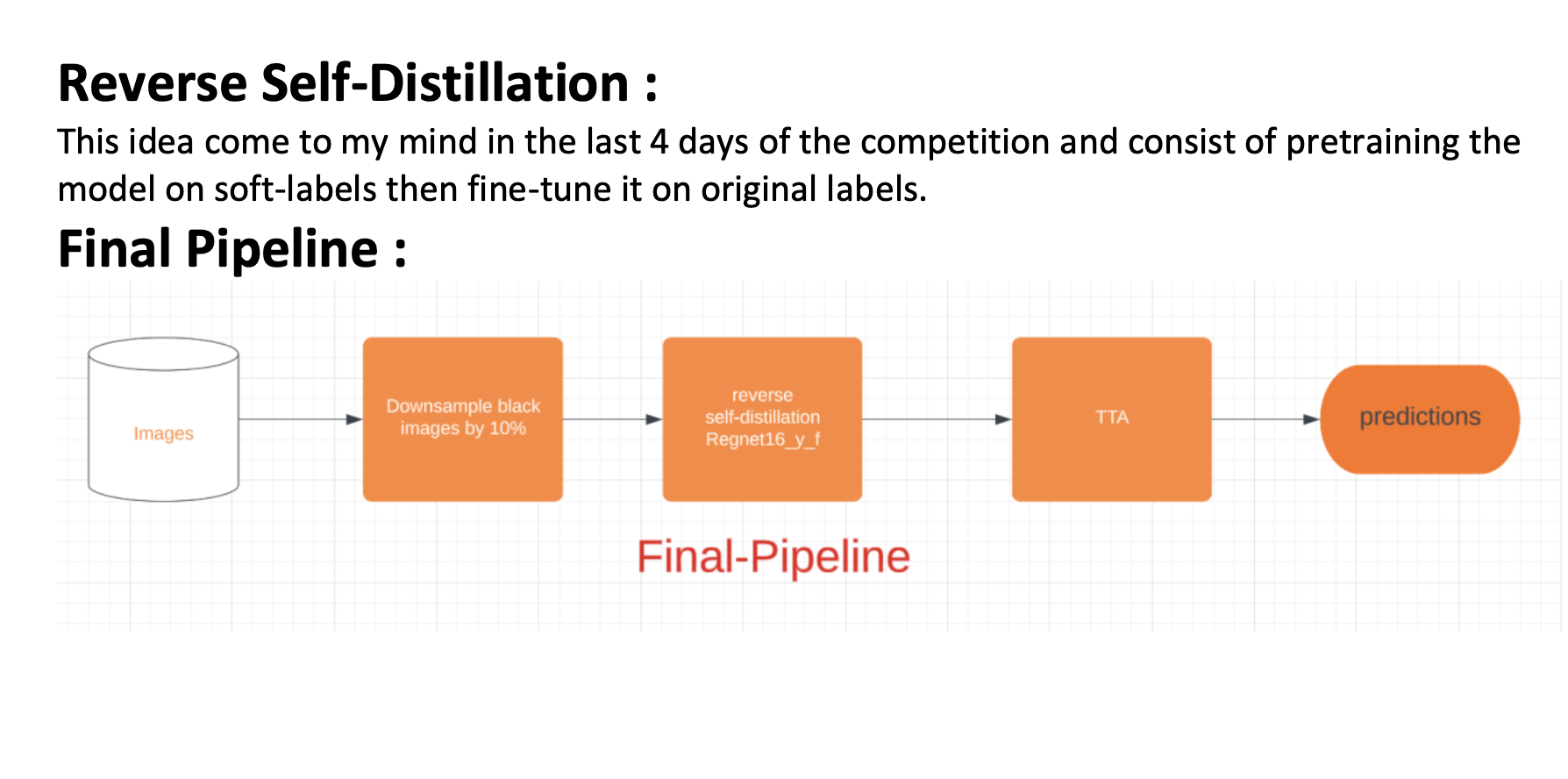 We had the same idea for the Reverse self-distillation part. But since pseudo-labeling had failed on our end, we thought this would bring to much noise. Great to see it worked for you.