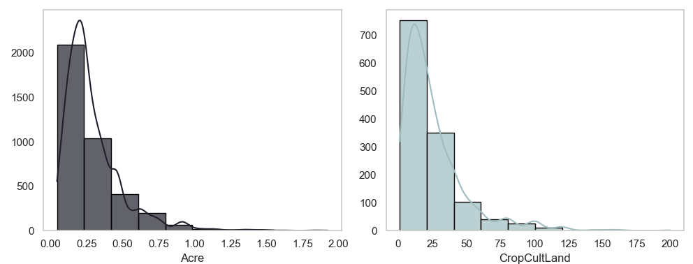 It seems that both "Acre" and "CropCultLand" refer to the same concept. The primary difference lies in the units of measurement. "Acre" is clearly measured in acres, a specific unit of land area. In contrast, "CropCultLand" does not specify any particular unit in its description, suggesting it might represent the land area in a different unit of measurement.