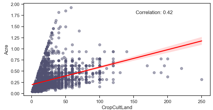 If this hypothesis is correct, the two should exhibit a strong linear relationship. However, this isn't the case. It's possible that "Acre" is a non-linear transformation of "CropCultLand" rather than a scaled version. Another possibility is that they originate from different data sources. Even if they're intended to represent the same information, discrepancies can occur due to the varied origins.