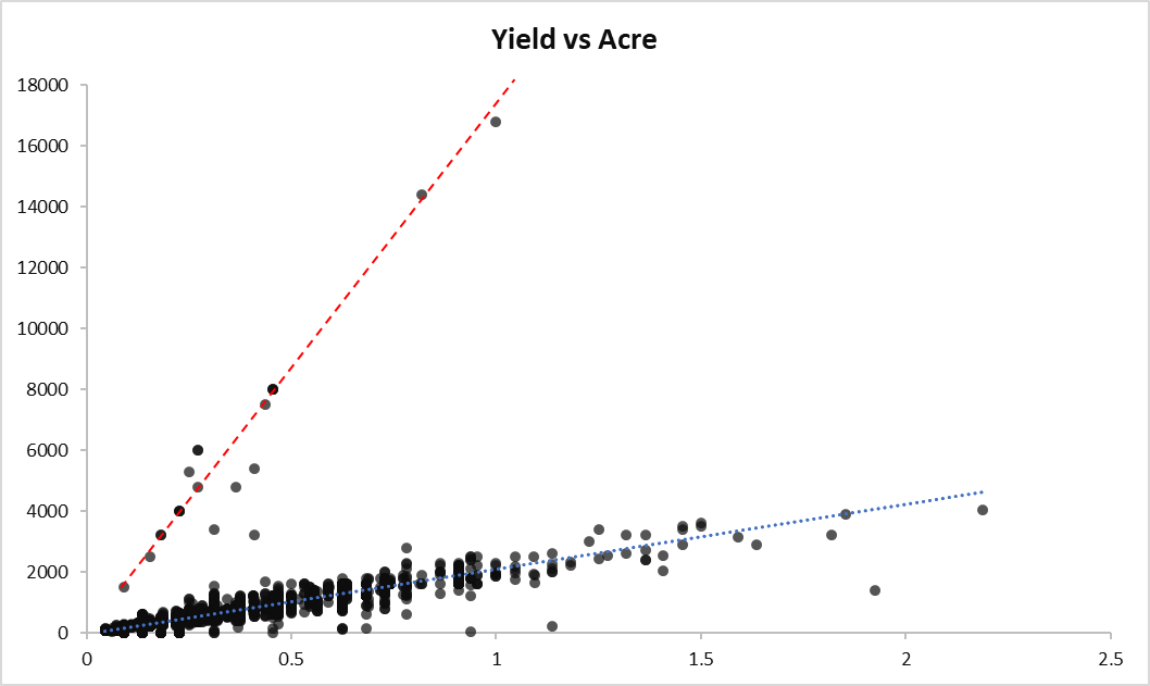 Let's be logical here – farmers generally have a good understanding of the expected yield range for each season. It's highly unlikely that a farmer anticipating, let's say, a yield of 1800 would suddenly end up with a yield 10 folds that amount.