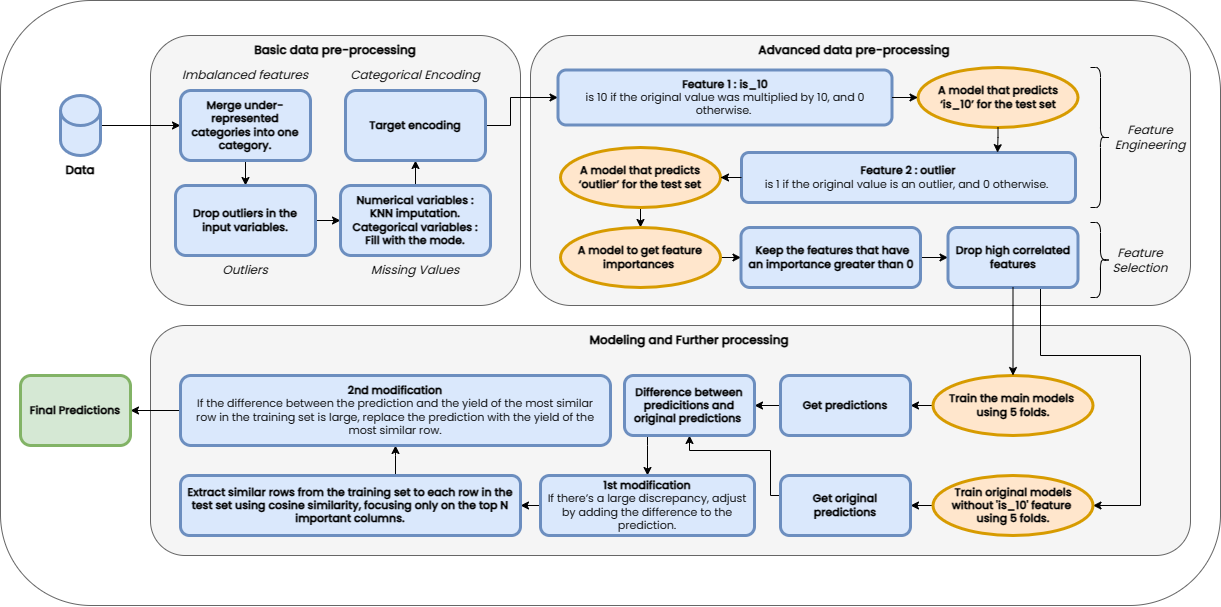 here’s my solution summarized in a schema. You can find more details in the notebook here: https://github.com/kamel-yamani/Digital-Green-Crop-Yield-Estimate-Challenge
