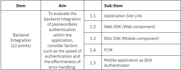 Participant A's final score is determined by adding up the individual scores as follows: 25 + 15 + 12 + 10 + 20 + 14 = 96 out of 130 points. This translates to a percentage of 73%. Below are the evaluation criteria, crafted to assess the effectiveness, user experience, and overall quality of the BSA integration.