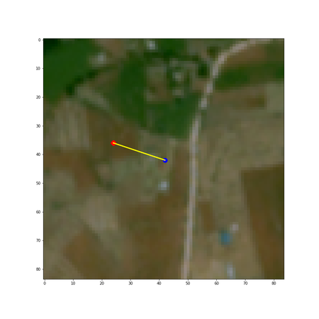 In this competition, you are given a list of maize fields associated with images from Planet and Sentinel-2 satellites. Original positions are considered images' centers as (0,0) and you are given a displacement vector for each field in the training set and you are required to predict these vectors for each vector in the test set. To illustrate more the displacement vector, the following is an image with original position as blue point, corrected position as red point and the displacement vector between the two positions in yellow: