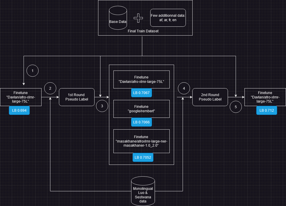 My solution is an Afro-xlmr-large model finetuned on the provided training data, some additionnal data ( afrikaans, arabic, french and english ) and the 2nd rounds of pseudo labels done on Luo & Setswana monolingual data.