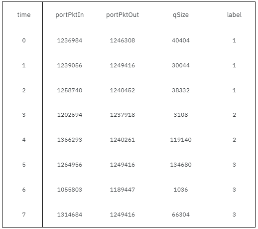 Each time point of data corresponds to a traffic status in a continuous time period. The adjacent data points have the same time interval, and each scenario in the data lasts for several consecutive time points. Within a single time point of data, only one scenario can occur, but the same scenario may occur in different time periods within one group of data. For instance, Scenario 1 may correspond to the traffic scenario when the traffic is initially sent and another corresponding scenario when the traffic data ends. Scenario 2 may occur between the two scenarios. It is important to note that typically, the same scenario of data will last for many periods of time, and the example data provided is used only to illustrate the data format.