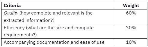 Efficiency will be evaluated using the following two solution parameters (equally weighted): size (memory) and compute requirements (GPU/CPU utilization).