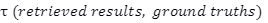 Where: Tau is Kendall's tau calculated between the ranking (or the order of appearance) of ground truths in the retrieved results and the ranking of ground truths in the reference.