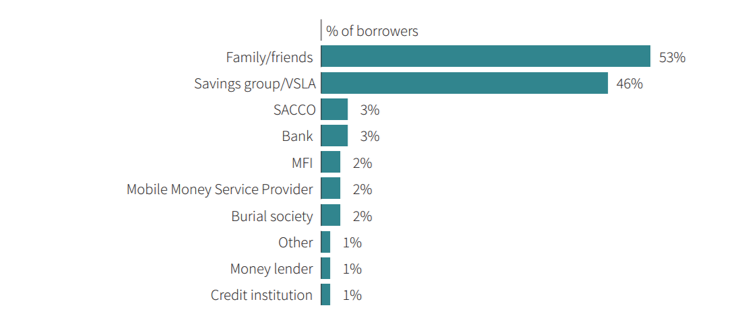 According to the Uganda FinScope 2018 survey findings, 46% (8.5 million) adults borrowed money during the 12-month period prior to the survey, with the majority borrowing to cover regular living expenses (such as education) during low-income periods. Further, the largest source of borrowing is from informal lenders i.e. savings groups, burial societies, community-based money lenders etc.
