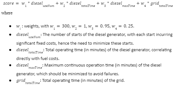 Participants are required to design an energy supply strategy that specifies when and which energy sources to use. The target is to minimize energy supply costs while ensuring the battery's remaining capacity is always at or above a set threshold. Specifically, when utilizing grid, solar, diesel sources, any surplus energy is used to charge the battery. Otherwise, the battery will discharge for the lack of energy.