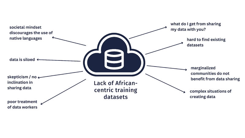 Africa faces many obstacles to adopting AI to solve its challenges, especially when implementation methods are simply copy-pasted from the Global North. One significant bottleneck to the effective implementation of “African-centric AI solutions” is the perceived lack of significantly large, high-quality, African-centric training datasets, brought about mostly by the lack of representation of African-centric content in the digital space. For example, ChatGPT, an AI chatbot language model developed by OpenAI, is said to have been trained ‘on the internet.’ However, African languages (2000+ of them) make up only about 0.1% of the languages represented on the internet (source). This means that the amazing capabilities of ChatGPT and other powerful models are not on par with African languages or generating African-centric content (the concept of a wedding ceremony in the US is different in Sudan, as demonstrated by Wafaa Mohammed in her Lanfrica Talk).