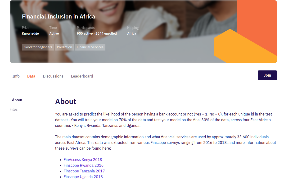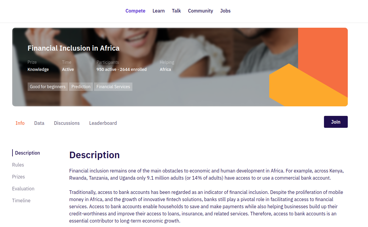 After understanding the Financial Inclusion in Africa competition page and its different sections, let’s solve the problem provided.
