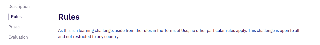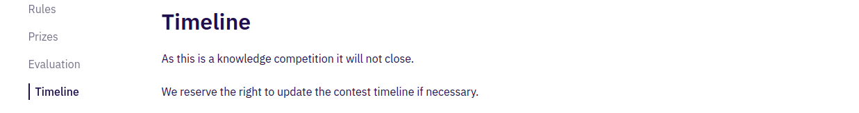 This section provides information about the start date of the competition and the end date and time of the competition. If you submit your solution after the deadline you will receive a score but it will not reflect on the leaderboard. Make sure to submit before the deadline if you want to be considered for a prize.