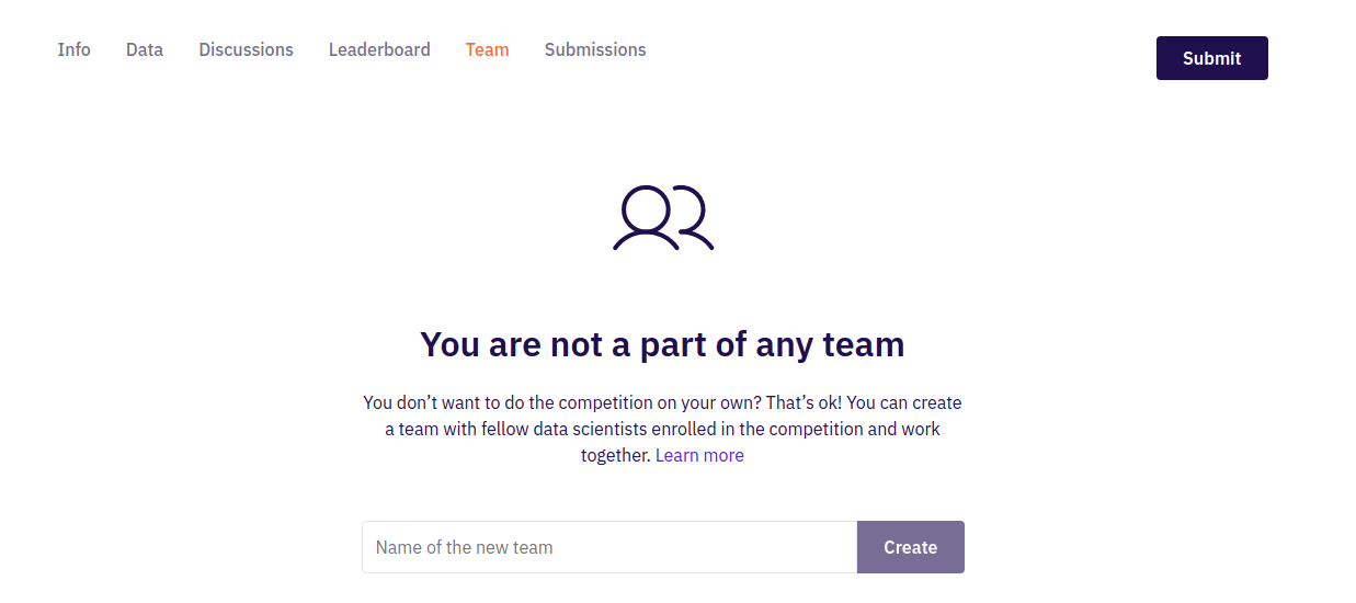You don’t want to do the competition on your own? That’s OK! You can create a team with fellow data scientists enrolled in the competition and work together. The maximum number for a team is 4 members. Remember that sharing code between individuals is not allowed, so if you want to share code with someone else, they must be on the same team as you.