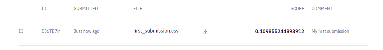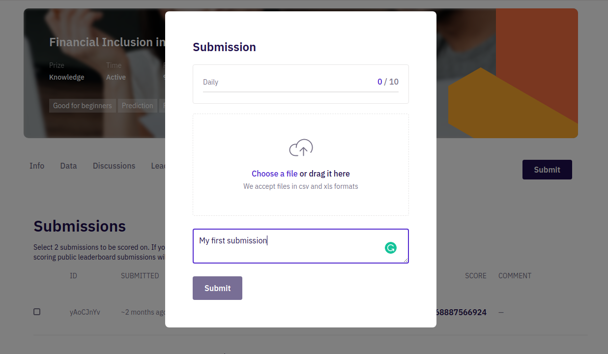 We named our submission file a first_submission.csv. Now we can upload it to the Zindi competition page by clicking the submit button and selecting the file to upload., You also have an option to add comments for each submission.