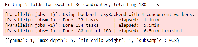 The above source code will evaluate which parameter values for min_child_weight, gamma, subsample and max_depth will give us better performance.