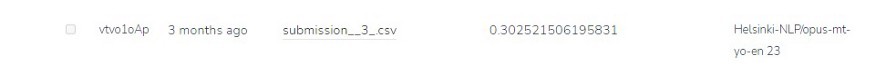 Using the power of transfer learning, we have created a model that performed quite well on generalized Yoruba text. The Helsinki NLP machine translation multilanguage model also performed quite well. I have experimented with many publicly available models, but HugginFace and opus-mt-mul-en by far perform the best on our low resource language. Due to Google Translate, machine translation research has seen a downfall, because Google Translate does not provide translation for low resource languages, so fine-tuning your machine translation model provides you with freedom to translate any low resource language using transformers. In the end, this was my starter code, and with multiple experiments and preprocessing the text, I got 14th rank in the competition with a final Rogue Score of 0.35168.