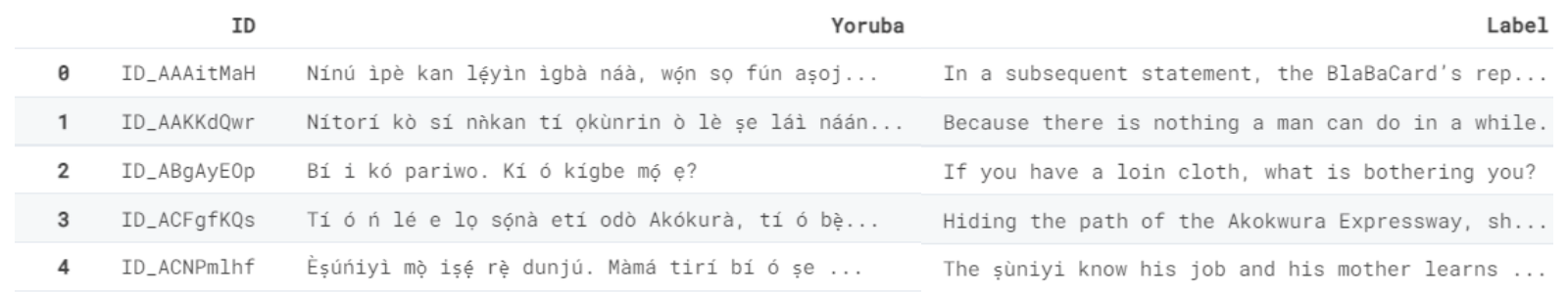 The training data consists of 10,054 parallel Yorùbá-English sentences. We have three column ID: unique identifiers; Yoruba: containing text in Yorùbá language; and English: text contains English translation of Yorùbá text. The data looks fairly clean, and there are no missing values.