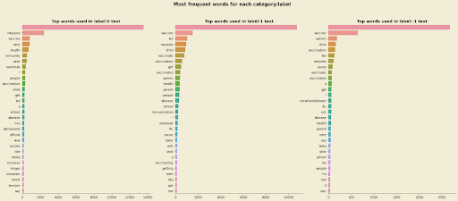 The chart above shows the top 30 frequently used words for each class. One observation we can make from the chart is that the word vaccination is top of all the classes. This means that our models will need to use other patterns to differentiate between tweets that are pro-vaccination.