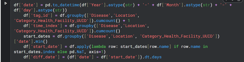 I started by converting Year, Month, and Day fields into proper datetime objects. From there, I created a time_index and diff_date (days from a reference point) to give the models temporal context. I also constructed a tag_id based on ['Disease','Location', 'Category_Health_Facility_UUID']—essentially a unique ID to track each disease-facility combo over time.