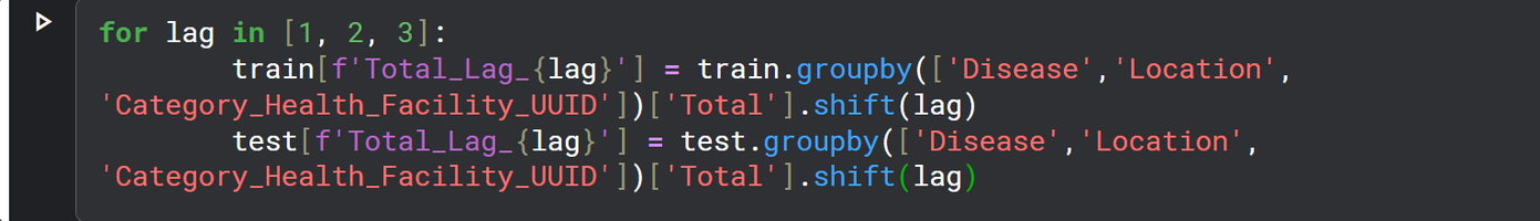 To pick up temporal dependencies, I generated lag features from the target variable (Total). These were grouped by ['Disease','Location', 'Category_Health_Facility_UUID'] and shifted backward by several months. This gave the model a way to “remember” what happened before.
