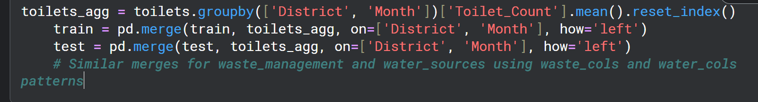 This part was key. I merged in external variables—soil moisture, surface temps, runoff, humidity, evaporation, and more ('tl2', 'tp', 'swvl1'...). I also brought in data from sanitation sources (toilets, waste, and water infrastructure) and aggregated those by location and month. These variables helped model disease risk based on environmental conditions.