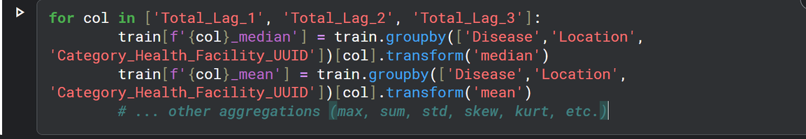 From the lagged target variables, I calculated summary stats: mean, median, max, min, skewness, kurtosis, quantiles, etc. Again, all grouped by ['Disease','Location', 'Category_Health_Facility_UUID']. These gave a kind of “profile” of how each disease behaves over time in each location.