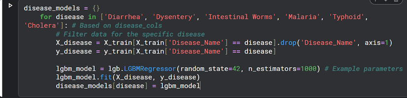 I trained individual models for each disease: 'Diarrhea', 'Dysentery', 'Intestinal Worms', 'Malaria', 'Typhoid', 'Cholera'. This allowed each model to specialize and learn the nuances of its disease.