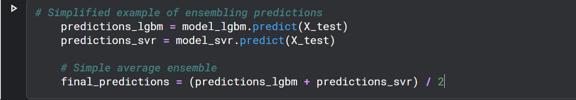 Final predictions came from blending outputs of the different models. LightGBM + LinearSVR + multiple transformations = a more stable and accurate forecast. This helped balance out the strengths and weaknesses of each approach.